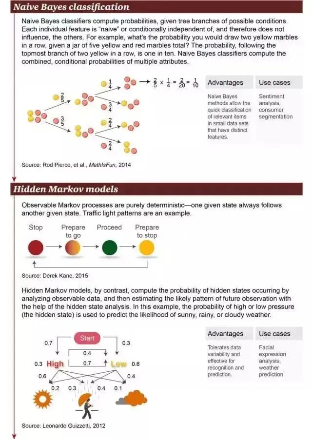 优点:对于在小数据集上有显著特征的相关对象,朴素贝叶斯方法可对其进行快速分类 5. 隐马尔可夫模型(Hidden Markov model) 显马尔可夫过程是完全确定性的——一个给定的状态经常会伴随另一个状态。交通信号灯就是一个例子。相反,隐马尔可夫模型通过分析可见数据来计算隐藏状态的发生。随后,借助隐藏状态分析,隐马尔可夫模型可以估计可能的未来观察模式。在本例中,高或低气压的概率(这是隐藏状态)可用于预测晴天、雨天、多云天的概率。