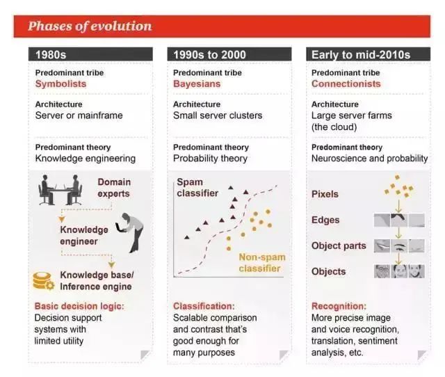 2. 演化的阶段 1980 年代 1990 年代到 2000 年 2010 年代早期到中期 3. 这些流派有望合作,并将各自的方法融合到一起 2010 年代末期 主导理论:记忆神经网络、大规模集成、基于知识的推理 2020 年代+ 主导理论:感知的时候有网络,推理和工作的时候有规则 2040 年代+ 感知和响应:基于通过多种学习方式获得的知识或经验采取行动或做出回答