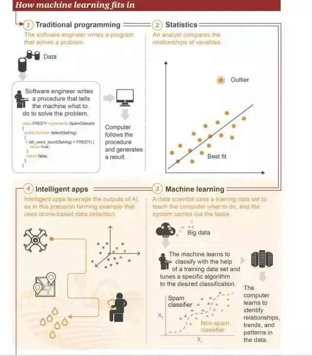 ③机器学习: 数据科学家使用训练数据集来教计算机应该怎么做,然后系统执行该任务。首先存在大数据→机器会学习使用训练数据集来进行分类,调节特定的算法来实现目标分类→该计算机可学习识别数据中的关系、趋势和模式