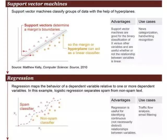 你应该使用哪种机器学习算法?这在很大程度上依赖于可用数据的性质和数量以及每一个特定用例中你的训练目标。不要使用最复杂的算法,除非其结果值得付出昂贵的开销和资源。这里给出了一些最常见的算法,按使用简单程度排序。更多内容可参阅机器之心的文章《机器学习算法集锦:从贝叶斯到深度学习及各自优缺点》和《经验之谈:如何为你的机器学习问题选择合适的算法?》