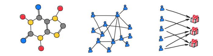 图可以方便地抽象关系和交互的复杂系统。社交网络、高能物理、化学等研究领域都涉及相互作用的对象(无论是人、粒子还是原子)。在这些场景下,图结构数据的重要性日渐凸显,相关方法取得了一系列初步成功,而一系列工业应用使得图深度学习成为机器学习方向的热门研究话题之一。图注:通过图对复杂系统的关系、交互进行抽象。例如,「分子图」中构成分子的原子至今的化学键,「社交网络」中用户之间的关系和交互,「推荐系统」中用户和商品之间的联系。