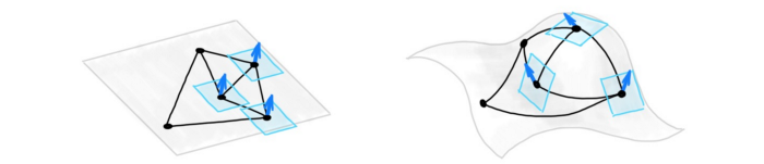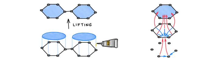 将演化方程解释为与物理系统相关的能量函数的梯度流,有助于理解学习模型。许多物理系统都有一个相关的能量泛函(有时也包含某些对称或守恒定律),其中控制系统动力学的微分方程是一个最小化的梯度流。例如,扩散方程使狄利克雷能量最小化,而它的非欧版本(Beltrami 流)使 Polyakov 泛函最小化,从而直观地理解了学习模型。利用最小作用原理,某些能量泛函可以导出双曲方程(如波动方程)。这些方程的解是波动的(振荡的),与典型的 GNN 动力学有很大的不同。分析这种流的极限情况提供了对模型表现的深刻理解,而这是很难通过其它方法获得的。例如,在论文“Neural Sheaf Diffusion: A Topological Perspective on Heterophily and Oversmoothing in GNNs”中,Michael 等人证明了传统的 GNN 必然会导致过平滑,并且只有在同质性假设下才具有分离的能力;在使用图上的额外结构可以获得更好的分离能力。在论文“Graph-Coupled Oscillator Networks”中,Michael 等人证明了振动系统在极限下可避免过平滑。这些结果可以解释为什么在某些 GNN 架构中会产生某些不良现象,以及如何设计架构来避免它们。此外,将流的极限情况与分离联系起来,揭示了模型表达能力的界限。可以在图中使用更丰富的结构。如前文所述,有时图的几何性质可能「不足」(无法捕获更复杂的现象,如非成对关系),也可能「过剩」(即难以在同质空间中表示)。我们可以通过使用额外的结构使图更丰富,从而处理图几何性质不足的问题。例如,分子包含环,化学家认为环是单一的实体,而不是原子和键(节点和边)的集合。Michael 等人的研究指出,图可以被「提升」为「简单元胞复合体」(simplicial- and cellular complexes)的高维拓扑结构。我们可以设计一个更复杂的消息传递机制,使信息不仅可以像在 GNN 中那样在节点之间传播,还可以在环这样的结构之间传播。恰当地构造这类「提升」操作使这些模型比传统的 WL 测试具有更强的表达能力。在论文“Neural Sheaf Diffusion: A Topological Perspective on Heterophily and Oversmoothing in GNNs”中,Michael 等人证明了,通过给节点和边分配向量空间和线性映射,可以给图配备一种额外的几何结构,即「元胞束」。传统的 GNN 隐式地假设图具有简单的底层束结构,这反映在相关扩散方程的性质和图拉普拉斯算子的结构上。与传统的 GNN 相比,使用复杂的「束」可以产生更丰富的扩散过程,有利于对其渐近行为。例如,在选择出的恰当的束结构上的扩散方程可以在极限的多个类中分离,即使在亲异环境中也是如此。从几何的观点来看,束结构类似于连接,这是微分几何中描述流形上向量的平行传输的概念。从这个意义上说,我们可以把束的学习看作是一种取决于下游任务演化图的几何结构的方法。Michaedl 等人证明,通过限制束的结构群(例如,限制为特殊的正交群),可以使节点特征向量只旋转,这样可以获得一些有趣的发现。图注:建立在图上的元胞束由附加在每个节点上的向量空间和连接它们的线性约束映射组成。这可以被认为是赋予图几何性质,约束映射与连接类似。「离散曲率类比」是另一种图几何结构的例子,这是微分几何领域用来描述流形局部性质的标准方法。在论文“Understanding over-squashing and bottlenecks on graphs via curvature”中,Michael 等人证明了负图 Ricci 曲率会对图上的信息流产生瓶颈,从而导致 GNN 中的过压缩现象。离散 Ricci 曲率可以被应用于高阶结构(三角形和矩形),这在许多应用中都很重要。这种结构对于传统的图嵌入来说有些「过剩」,因为图是异构的(非常曲率)。对于通常用于嵌入的空间,即使是非欧空间,也是同构的(常曲率)。在论文“Heterogeneous manifolds for curvature-aware graph embedding”中,Michael 等人展示了一种具有可控 Ricci 曲率的异构嵌入空间的构造,可以选择与图的曲率匹配的 Ricci 曲率,不仅可以更好地表示邻域(距离)结构,而且可以更好地表示三角形和矩形等高阶结构。这些空间被构造成同构、对旋转对称的流形的乘积,可以使用标准黎曼梯度下降方法进行有效优化。