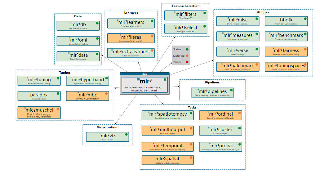 回答:我们可以简单理解,mlr3包是一个主体,但是毕竟我们机器学习是一个很广阔的领域,所以为了实现更多功能,作者把各种方法按照模块进行了打包,封装成了一个又一个R包,mlr3包作为主体,其周围还有很多补充的R包,下面这张图就展示了mlr3包的“生态环境”(Ps:如果运行代码其实没有任务或者没有学习器,那么大概率就是没有加载相应的R包)