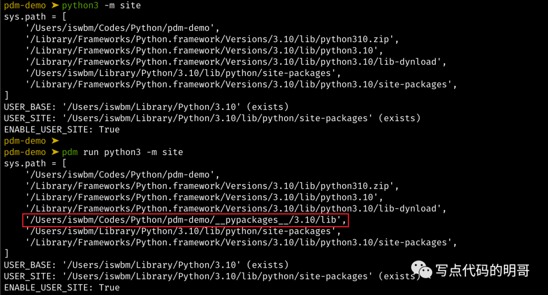 从下图可以看到使用 pdm 工具后,无疑就是在全局的 site-packages 目录之前加上项目目录里的 __pypackages__ 路径,使得 __pypackages__ 的搜索优先级高于全局的 Python 环境。