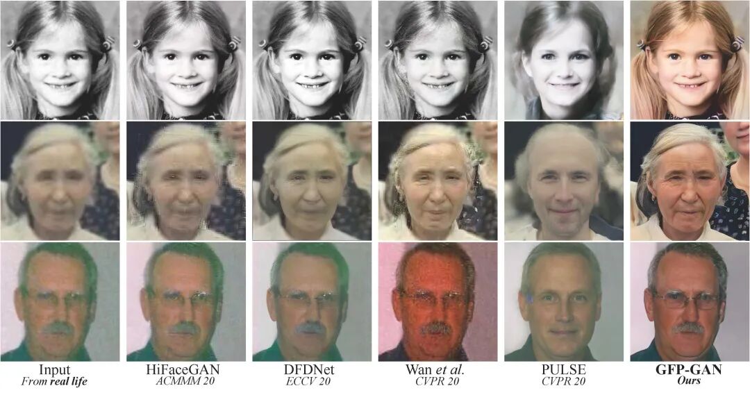 GFPGAN 是腾讯开源的人脸修复算法,从效果图上看来 GFPGAN 的修复成果更清晰、更贴近现实。