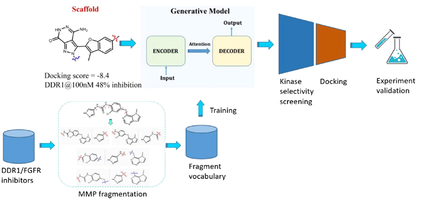 新药发现是一个高成本、高风险、周期长的项目,通常一个新药的成功上市需花费10-15年以及百亿美元的研发成本。随着人工智能技术的飞速发展,将这些技术拓展至药物设计中成为了药物发现的新思路与途径,为缩短药物研发周期降低研发成本带来了新的希望。中科院上海药物所郑明月课题组在美国化学会出版的药物化学核心期刊Journal of MedicinalChemistry上发表综述文章(J. Med. Chem. 2021, 64, 19, 14011–14027.)【1】,讨论了生成模型在药物设计中的应用。作者首先简单介绍了目前主流生成模型所使用的基本框架以及数学原理,其中包括循环神经网络(Recurrent NeuralNetwork, RNN),自编码模型(Auto-Encoder, AE)、对抗生成神经网络(GenerativeAdversarial Network, GAN)、Transformer模型以及一些通过强化学习训练的智能体。随后作者讨论了目前生成模型在药物设计过程中的主要用途,包括产生新分子并扩充现有化合物库和定向分子设计等。生成模型中,分子表征的方式主要为SMILES式(如ChemicalVAE和GrammarVAE等)或分子图(如JT-VAE,DeLinker等)。尽管分子的表述方式不同,但大部分生成模型均是概率模型,即通过学习训练集中数据的概率分布后可以生成符合该概率分布的新样本,从而实现分子生成的目标。分子生成模型的重要应用场景之一是实现分子数据库扩增。有研究表明,即使只利用一个数据集中0.1%的样本对模型进行训练,模型依然能重新复现整个数据集中68.9%的分子,这说明通过分子生成模型实现分子数据库扩增是高效的。目前,已有不少经过生成模型扩增的数据库,如GDB、ZINClick、Real和DrugSpaceX等,同时这些数据库也成功在虚拟筛选中应用,发现了活性分子。另外,通过让模型学习分子结构和某些理化性质的联合概率分布,即可实现定向分子生成(如CVAE、LigGPT等),从而使得在探索庞大化学空间的过程中更加高效。除此方法之外,在生成模型的隐空间中使用如贝叶斯优化算法等方法也可实现定向分子生成的目标。最后,作者也讨论了目前对于生成模型性能测试的标准数据集如MOSES和一些评价指标,主要包括分子有效性(validity)、特异性(uniqueness)、新颖性(novelty)以及片段骨架相似性等等。虽然生成模型在药物设计中取得了一些成功,但仍有很多不可回避的问题。例如大部分定向分子生成模型在进行测试时,其定向生成的目标仅是一些简单的分子性质,如cLog P、氢键供体数或受体数等等,以针对于靶标蛋白活性为优化目标的测试报道很少,这主要源于已知的活性分子的数据有限,模型很难从极少的数据中学到分子结构与活性的联合概率分布,而事实上,设计生成具有生物活性的分子才是药物化学家所真正关心的。另外,目前常用的评价指标也不能非常客观评价模型表现。以新颖性为例,在计算这一指标时,仅仅是考虑模型生成的分子有多少不包涵在训练数据之中,那么即使简单的变换官能团位置也可被认为是“新颖”分子,这与药物化学家所认为的“新颖”分子完全不同。最重要的是,目前报道生成模型的文章中常常没有实验验证,而仅是展示一些测试指标,而这些测试指标并不能反映这些模型在实际应用中的效果如何。例如通过生成模型扩展的分子库中很多分子都是未知化合物,即使在虚拟筛选中命中也无法直接购买。尽管如此,也有一些生成模型设计的分子经过了实验的验证。最有名气的当属Insilicon公司利用开发的分子生成模型GENTRL,仅用46天即成功发现高活性高选择性DDR1抑制剂。上海药物所郑明月课题组也报道了利用分子生成模型进行基于骨架的药物设计。在这项工作中,作者首先收集了大量活性分子,并将其切割为骨架-片段对并用于训练生成模型。完成训练之后以待优化的骨架作为输入让模型进行修饰,最终成功发现高活性高选择性DDR1抑制剂(图1)。该工作也受到广州生物岛实验室陈红明老师的关注,并在JMC上发表评述文章(J. Med. Chem. 2022, 65, 1, 100–102)【2】,称赞这项工作是生成模型在分子设计优化中的示范性工作,推动了人工智能驱动药物研发的应用。