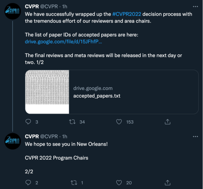 3月2日,计算机视觉三大顶会之一的CVPR2022论文接收结果公布,在经历了漫长的社交媒体静默期后,社交媒体被论文作者刷屏了,部分作者还展示了自己的论文成果。