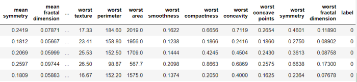 项目的实验数据来源著名的UCI机器学习数据库,该数据库有大量的人工智能数据挖掘数据。本例选用的是sklearn上的数据集版本:Breast Cancer Wisconsin DataSet(威斯康星州乳腺癌数据集),这些数据来源美国威斯康星大学医院的临床病例报告,每条样本有30个特征属性,标签为是否良性肿瘤,即有监督分类预测的问题。 项目的建模思路是通过分析乳腺癌数据集数据,特征工程,构建逻辑回归模型学习数据,预测样本的类别是否为良性肿瘤。