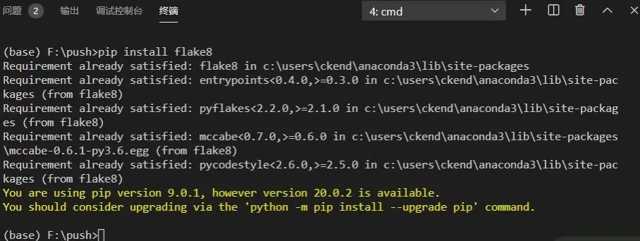1. 打开终端,输入 pip install flake8 安装flake8,我已经装过了,你的提示应该跟我的不一样: