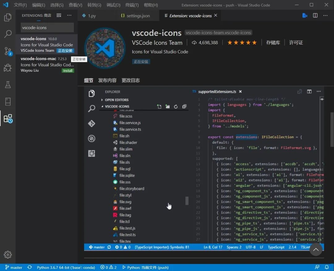 默认的VSCode图标没有那么详细,只有几个重要文件类型的图标提示,可以安装vscode-icons解决,Mac的有vscode-icons-mac版本。如图所示: