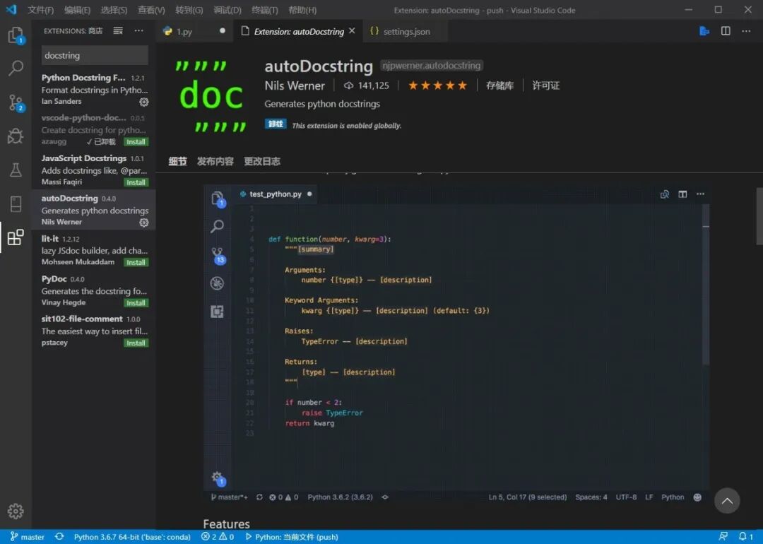 这个是我强烈推荐的插件,搜索docstring,目前排在第四位,由Nils Werner开发的autoDocstring,优秀的代表: