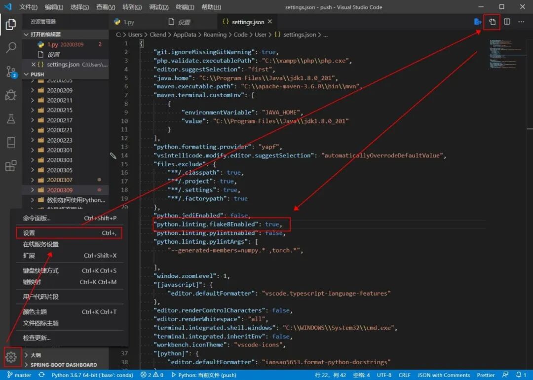 2. 在settings.json文件中输入"python.linting.flake8Enabled": true