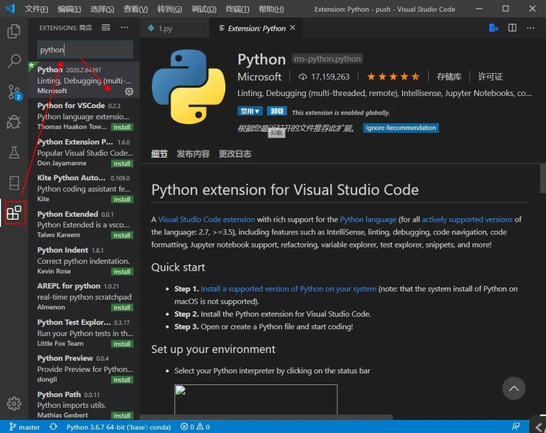 很多同学都想一键运行Python,而非以命令的形式运行,这时候就需要Python扩展了,打开扩展页,输入Python,选择第一个进行安装 install 即可: