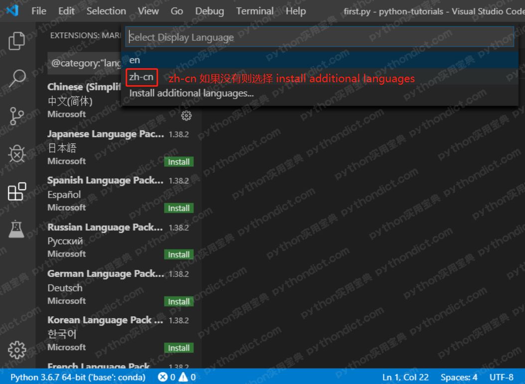 如果没有zh-cn的选项,则选择install additional languages (添加其他语言选项),左边会弹出扩展窗口,扩展窗口找到中文简体,点击 install 安装,重复 第 1, 2 步骤 选择中文即可。