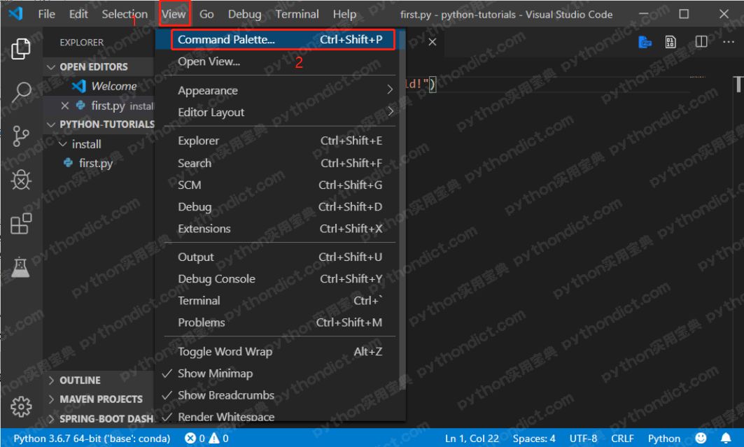 1. 点击View - Command Palette (或输入 Ctrl + shift + P) 进入命令面板.