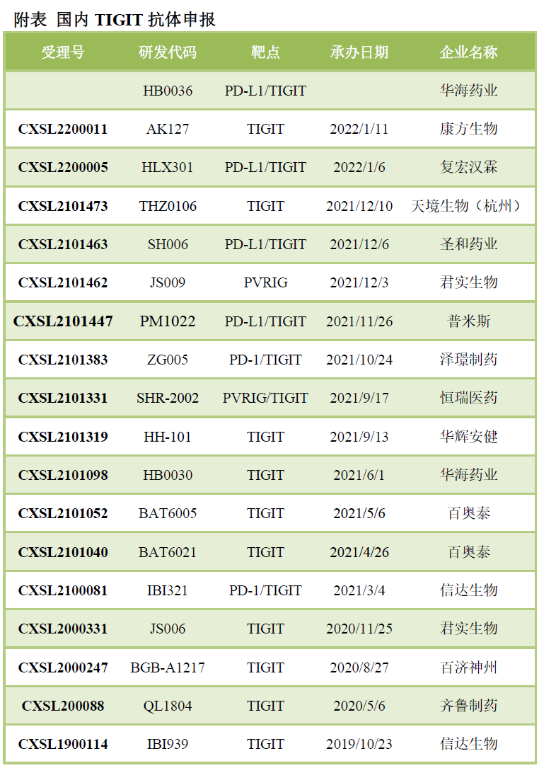 基于以上的机理,TIGIT靶点也一直有下一代免疫检查位点抑制剂新贵之说,不少企业也开始涉及该靶点的药物研发,尤其以罗氏的投入力度最大。同时阻断TIGIT与PD-L1/PD-1可能产生协同抑制肿瘤的作用,罗氏也开始不断探索TIGIT抑制剂与泰圣奇的联用。