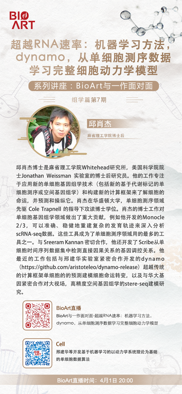 本周“一作论坛”为组学篇,时间是4月1日20:00-21:00,由麻省理工学院博士后邱肖杰报告,题目为:超越RNA速率:机器学习方法,dynamo,从单细胞测序数据学习完整细胞动力学模型,届时欢迎大家参加直播。