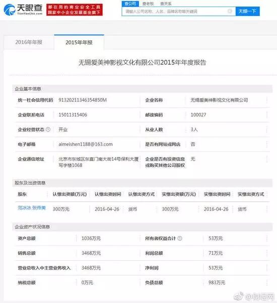 据天眼查无锡爱美神影视文化公司2015年报显示,范冰冰任大股东的无锡爱美神影视文化有限公司,2015年主营业务收入3468万元,净利润53万元,而纳税总额为0元,公司负债总额为983万元。对此,范冰冰方面回应称,由于税务局正在核查,所以所有的税收数字不显示,并非纳税额为0。