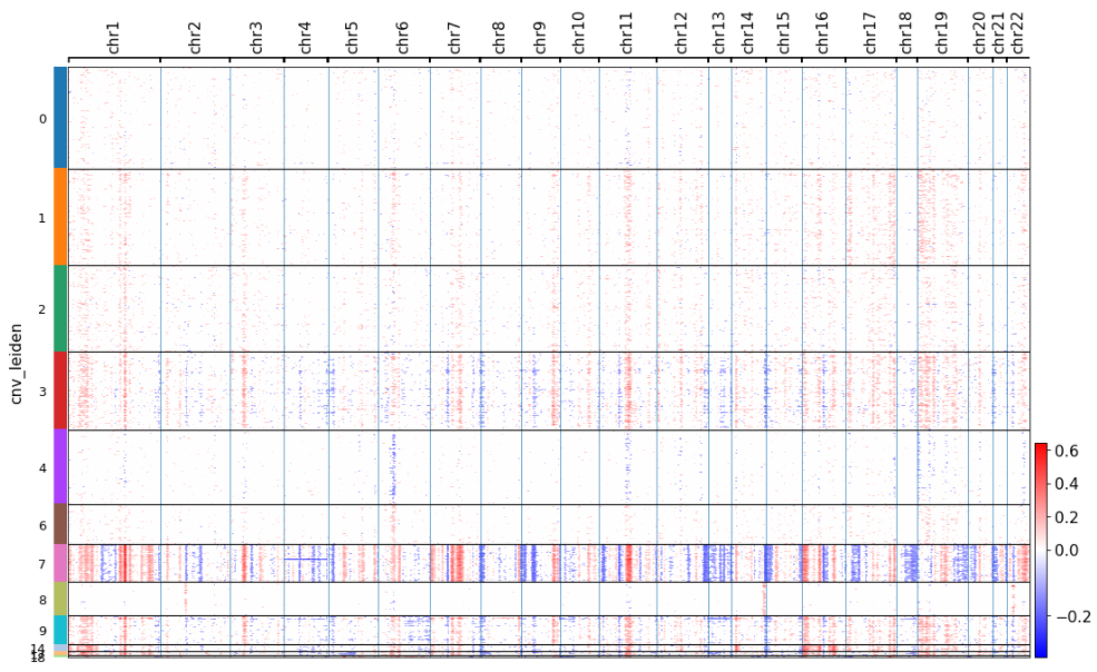 在进行leiden聚类后,我们可以通过CNV聚类来绘制染色体热图。我们可以观察到,与底部的clusters不同,顶部的clusters基本上没有差异表达的基因组区域。差异表达区域可能是由于复制数量的变化,而相应的clusters可能代表肿瘤细胞