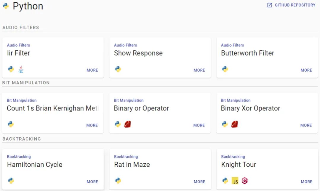 这里以 Python 编程语言实现的算法为例,我们可以看到音频滤波器(Audio Filters)、位操作(Bit Manipulation)、回溯(Backtracking)算法等。同样点击每个算法右下的「More」链接到详情页。