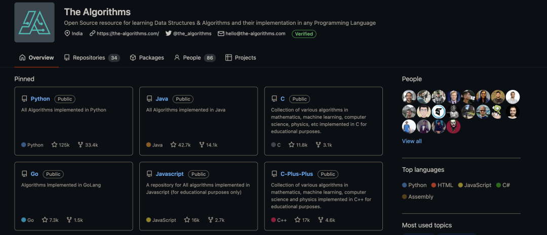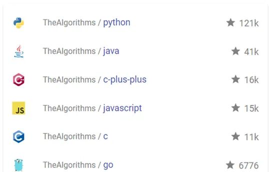 最后,「The Algorithms」库还分别提供了用 Python、Java、C、C++ 等数十种编程语言实现的算法,每种语言都有自己的 GitHub 算法代码库。