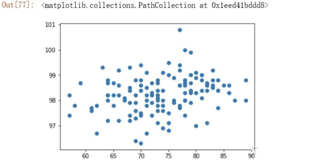 ''' heartrate_s = data['HeartRate' ] temperature_s = data['Temperature' ] from matplotlib import pyplot as pltplt.scatter(heartrate_s, temperature_s)