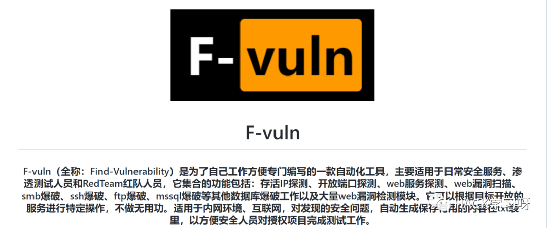 专门编写的一款自动化工具,主要适用于日常安全服务、渗透测试人员和RedTeam红队人员,它集合的功能包括:存活IP探测、开放端口探测、web服务探测、web漏洞扫描、smb爆破、ssh爆破、ftp爆破、mssql爆破等其他数据库爆破工作以及大量web漏洞检测模块
