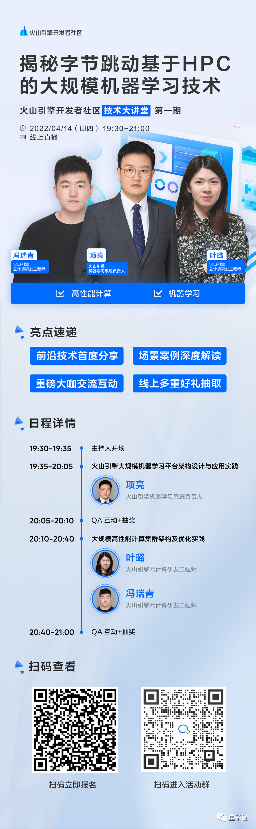4 月 14 日晚间 19:30-21:00,火山引擎开发者社区技术大讲堂第一期将为大家揭秘字节跳动基于 HPC 的大规模机器学习技术,技术负责人项亮开深度分享机器学习平台架构与实践,与广大开发者互动。同时,承载机器学习平台的超大规模 HPC 基础设施也将首度在社区分享。