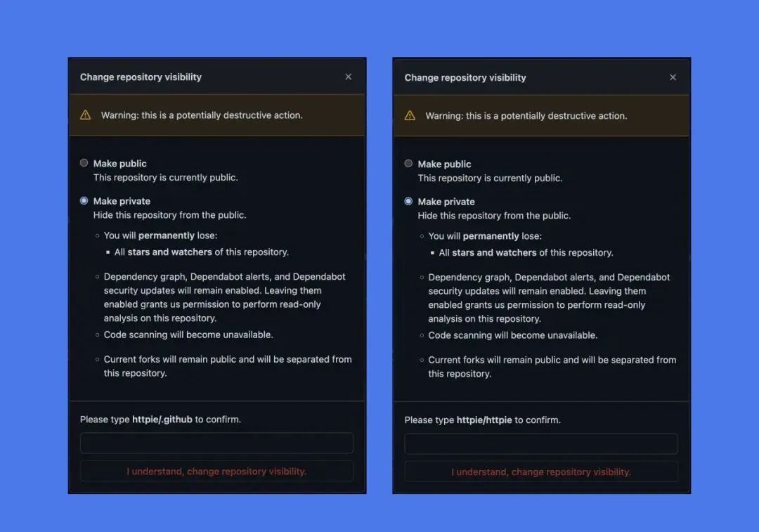 可是,这个确认框的内容一成不变:不论是对于没有 Star、没有内容的存储库,还是面对具有十年历史、54k+ Star 的存储库,这个确认框都几乎一模一样(只有最后一行的 httpie/httpie 和 httpie/.github 不同)——这对此前刚在其个人资料中顺利隐藏了一个空 README 文件的 Jakub Roztočil 来说,确认框的提醒作用聊胜于无。