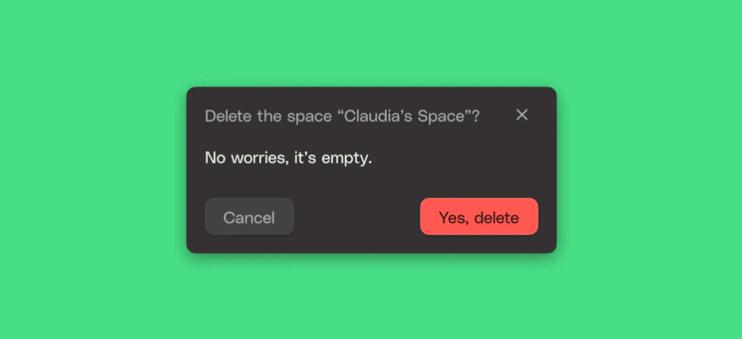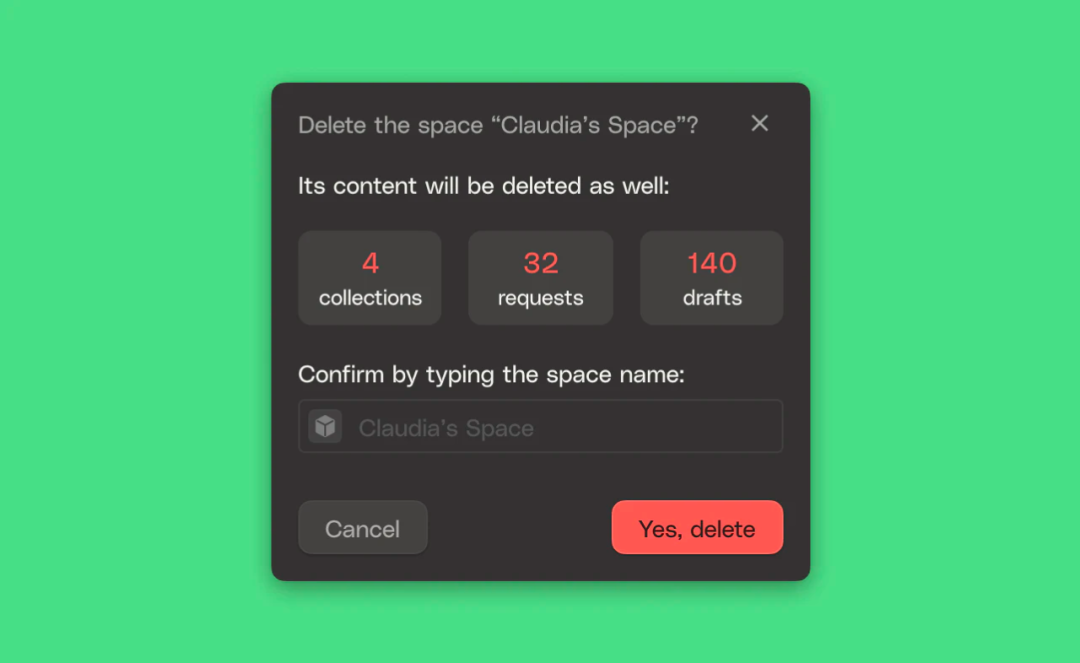 这次危机让我们得到了很多教训,这里主要分享 3 点:弹出的对话框要清晰明了,减少抽象的文字说明。以一种不需要用户思索的方式设计确认对话框。当用户要删除或损坏某些文件时,不要用抽象的语言描述,以免让用户难以了解即将发生的状况,特别是会造成级联删除的行为。例如,以下是我们在 HTTPie for Desktop 中的处理方式: