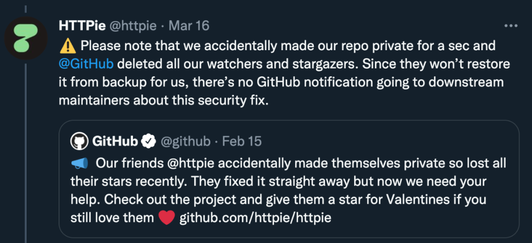 2022 年 2 月 15 日,GitHub 通过推特平台广播了一则消息:「我们的朋友 HTTPie 最近不小心将自己设为了私密,丢掉了所有的 Star。如果你仍然爱它,就给它一颗 Star 作为情人节礼物。」