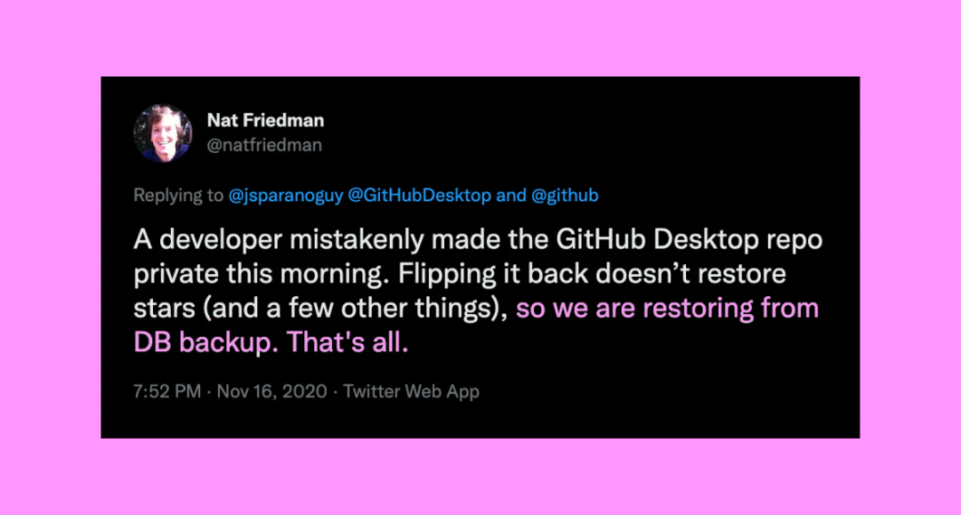 为什么这么久呢?因为这是 GitHub 级联删除我们 10 年来的 Star 和关注者所花费的时间。而且我没有办法阻止这个过程。我所能做的就是开始发消息给 GitHub 寻求支持,刷新页面并等待 Star 数量达到零,然后才能再次将其公开。GitHub 显然有备份,并且有恢复 repo 的方法。GitHub 团队曾经自己不小心将 GitHub 桌面应用程序 repo 设为私有,然后他们在几个小时内就恢复了一切,当时前 GitHub CEO 给出的解释是:
