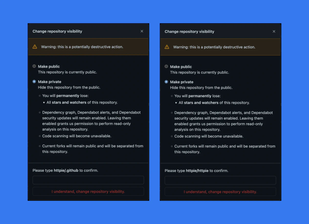 最直接的原因是我认为我在另一个 repo 中——一个没有内容且 0 Star 的项目。我真正打算做的是隐藏 HTTPie 组织的配置文件 README,这是我在一周前创建但没有机会填充的。让我走上错误道路的是一个完全不相关的操作:我刚刚在我的个人资料上做了同样的事情(即隐藏了一个空的 README),将其设为 jakubroztocil/jakubroztocil 私有。在配置文件和存储库方面,GitHub 的概念模型会将用户和组织视为非常相似的实体。在这种情况下,由于我只是想在我们组织的个人资料上重复相同的操作,我的大脑切换到了「自动驾驶」模式。目前我没有意识到这个包含配置文件 README 的特殊 repo 的命名存在不一致问题,并且它对于用户和组织有所不同:name/name 与 name/.github.这就是为什么我一开始要隐藏 httpie/httpie,而不是 httpie/.github,并且没有意识到我的错误。确实有一个确认框,旨在阻止像我这样的情况下的用户做一些愚蠢的事情。它会告诉你「你将永远失去这个存储库的所有 Star 和关注者」。问题在于,对于没有提交和任何 Star 的 repo ,它的提示框和具有 10 年历史及 55k Star 与关注者的 repo 是完全一样的。它说的是:「警告:这是一个潜在的破坏性行动。」