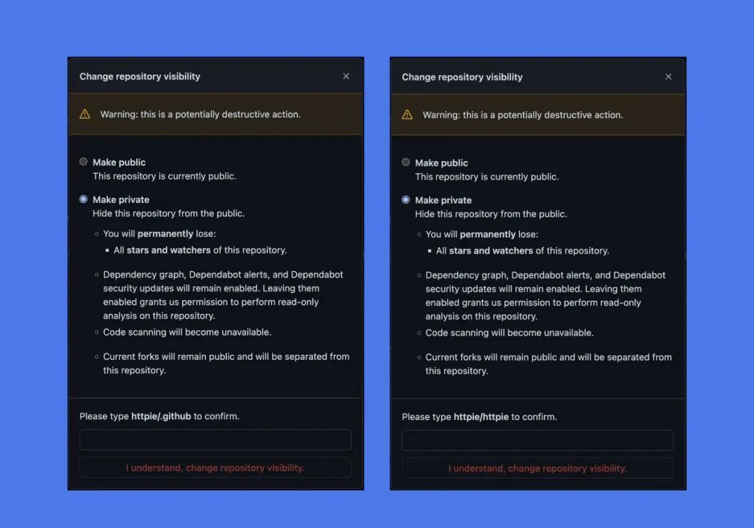 可是,这个确认框的内容一成不变:不论是对于没有 Star、没有内容的存储库,还是面对具有十年历史、54k+ Star 的存储库,这个确认框都几乎一模一样(只有最后一行的 httpie/httpie 和 httpie/.github 不同)——这对此前刚在其个人资料中顺利隐藏了一个空 README 文件的 Jakub Roztočil 来说,确认框的提醒作用聊胜于无。