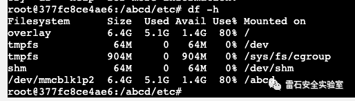 通过df -h 命令查看磁盘,新建文件夹/abcd,然后将宿主机的文件系统挂载到docker容器中的/abcd 目录。