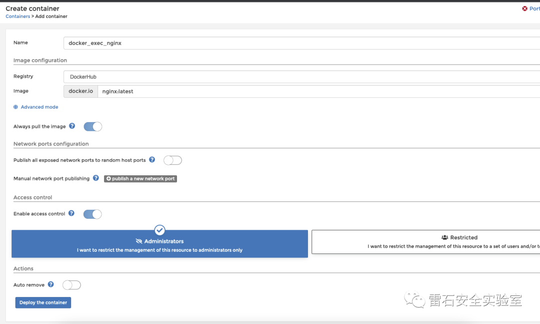 我想到如果在docker容器启动中加上--privileged参数即特权模式,就可以磁盘挂载利用了。进行挂载后,可以进行对本地宿主机的文件替换比如写入公钥getshell, 想到这一点,我点击新建容器。选择了nignx:latest 镜像