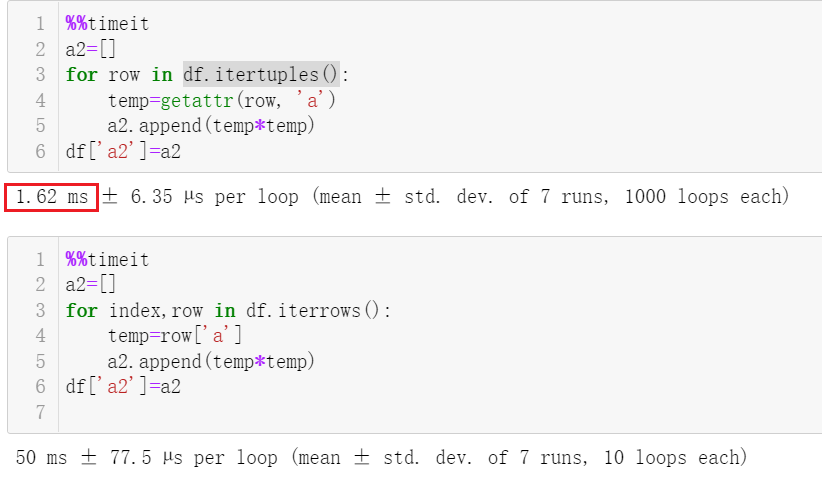 import pandas as pd import numpy as np import time df = pd.DataFrame({'a' : np.random.randn(100000), 'b' : np.random.randn(100000), 'N' : np.random.randint(100, 1000, (100000)), 'x' : np.random.randint(1, 10, (100000))}) %%timeit a2=[]for row in df.itertuples(): temp=getattr(row, 'a' ) a2.append(temp*temp) df['a2' ]=a2 %%timeit a2=[]for index,row in df.iterrows(): temp=row['a' ] a2.append(temp*temp) df['a2' ]=a2 4.2 apply、applymap优化当对于每行执行类似的操作时,用循环逐行处理效率很低。这时可以用apply或applymap搭配函数操作,其中apply是可用于逐行计算,而applymap可以做更细粒度的逐个元素的计算。