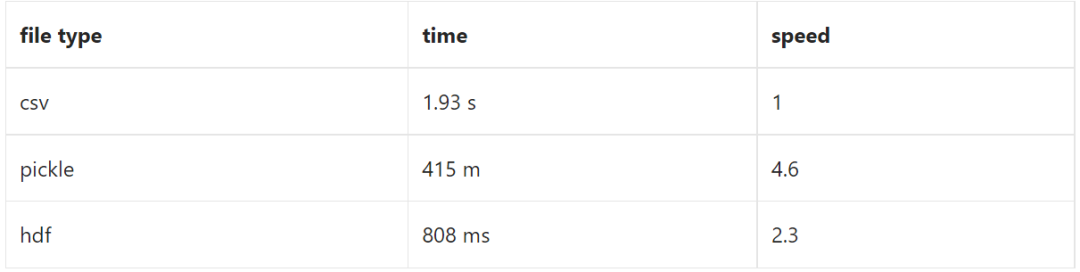%timeit df.groupby("x" )['a' ].agg(lambda x:x.sum()) %timeit df.groupby("x" )['a' ].agg(sum) %timeit df.groupby("x" )['a' ].agg(np.sum) 4.4 文件操作pandas读取文件,pkl格式的数据的读取速度最快,其次是hdf格式的数据,再者是读取csv格式数据,而xlsx的读取是比较慢的。但是存取csv有个好处是,这个数据格式通用性更好,占用内存硬盘资源也比较少。此外,对于大文件,csv还可以对文件分块、选定某几列、指定数据类型做读取。