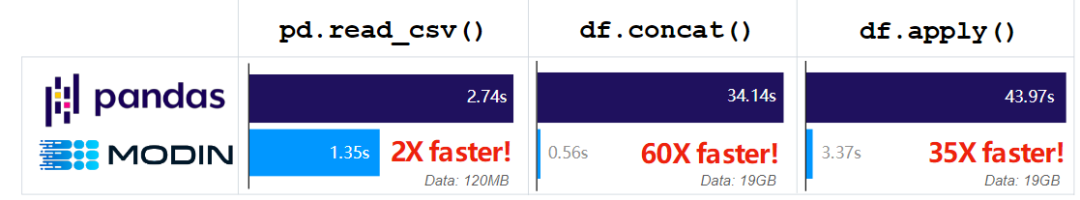 import pandas as pd import swifter df.swifter.apply(lambda x: x.sum() - x.min()) 7、ModinModin后端使用dask或者ray(dask是类似pandas库的功能,可以实现并行读取运行),是个支持分布式运行的类pandas库,简单通过更改一行代码import modin.pandas as pd就可以优化 pandas,常用的内置的read_csv、concat、apply都有不错的加速。注:并行处理的开销会使小数据集的处理速度变慢。