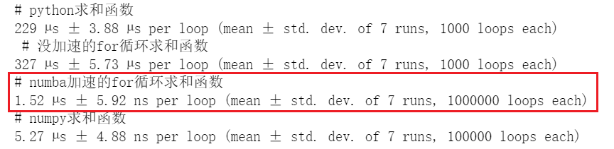 # pip install numba import numba as nb# 用numba加速的求和函数 @nb.jit() def nb_sum(a): Sum = 0 for i in range(len(a)): Sum += a[i] return Sum# 没用numba加速的求和函数 def py_sum(a): Sum = 0 for i in range(len(a)): Sum += a[i] return Sum import numpy as np a = np.linspace(0,1000,1000) # 创建一个长度为1000的数组 print ('# python求和函数' ) %timeit sum(a) print ('# 没加速的for循环求和函数' ) %timeit py_sum(a)print ('# numba加速的for循环求和函数' ) %timeit nb_sum(a) print ('# numpy求和函数' ) %timeit np.sum(a) 当前示例可以看出,numba甚至比号称最接近C语言速度运行的numpy还要快5倍+,对于python求和速度快了几百倍。。