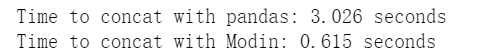 !pip install modin import pandas import modin.pandas as pd import time## pandas pandas_df = pandas.DataFrame({'a' : np.random.randn(10000000), 'b' : np.random.randn(10000000), 'N' : np.random.randint(100, 10000, (10000000)), 'x' : np.random.randint(1, 1000, (10000000))}) start = time.time() big_pandas_df = pandas.concat([pandas_df for _ in range(25)]) end = time.time() pandas_duration = end - startprint ("Time to concat with pandas: {} seconds" .format(round(pandas_duration, 3)))#### modin.pandas modin_df = pd.DataFrame({'a' : np.random.randn(10000000), 'b' : np.random.randn(10000000), 'N' : np.random.randint(100, 10000, (10000000)), 'x' : np.random.randint(1, 1000, (10000000))}) start = time.time() big_modin_df = pd.concat([modin_df for _ in range(25)]) end = time.time() modin_duration = end - startprint ("Time to concat with Modin: {} seconds" .format(round(modin_duration, 3)))print ("Modin is {}x faster than pandas at `concat`!" .format(round(pandas_duration / modin_duration, 2)))- END -