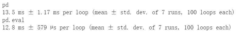 4.5 pandas.evalpandas.eval 是基于第一节提到的numexpr,pandas也是基于numpy开发的,numexpr同样可以被用来对pandas加速)。使用eval表达式的一个经验是数据超过 10,000 行的情况下使用会有明显优化效果。