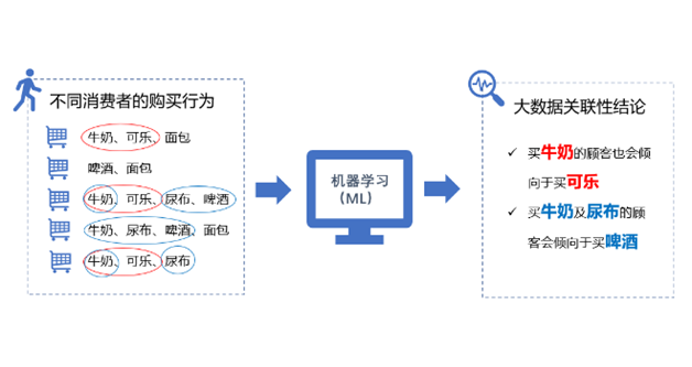 机器学习算法没有办法告诉您原因是什么,只会告诉您有这个现象和关联性。我们会使用不侵犯用户隐私的数据来做机器学习。我们知道用户买了牛奶或可乐并不是侵犯隐私,因为我也不知道具体是谁在购买,我们做的就是当您买了牛奶尿布,给您推啤酒的广告。