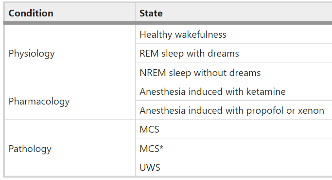 但是,快速眼动睡眠状态(REM)和氯胺酮引起的麻醉状态有较低的「清醒程度」和较高的「认知能力」,这两种状态和其它的状态有显著的区别。
