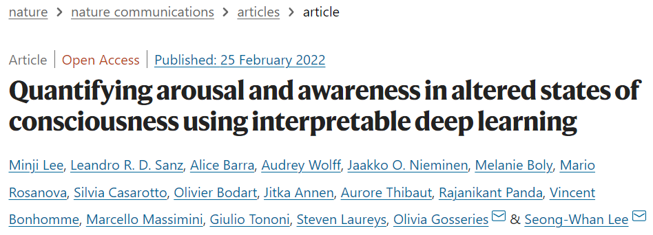 论文题为《利用可解释的深度学习量化不同状态下的唤醒和意识》,发表在今年2月25日的《自然通讯》上。