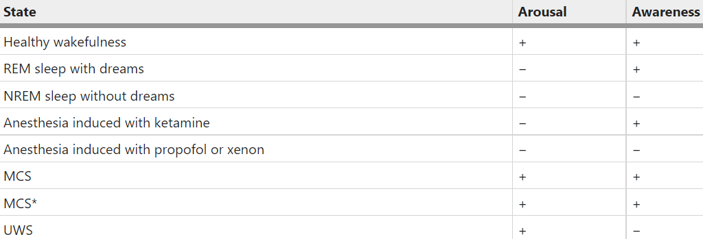 意识将由两部分来描述:一部分叫做Arousal,即「清醒状态」,另一部分叫做Awareness,指人的「认知能力」。