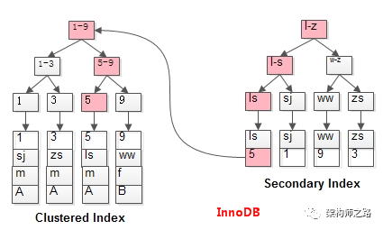 如上图,通过前序知识,容易知道InnoDB在主键id上会建立聚集索引(Clustered Index),叶子存储记录本身,在name上会建立普通索引(Secondary Index),叶子存储主键值。发起主键id查询时,能够通过聚集索引,直接定位到行记录。