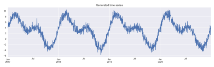 最后,我们必须创建时间序列本身。为此,我们将两条变换的正弦曲线和一些随机噪声结合起来。用于生成数据的代码基于scikit-lego文档中包含的代码。