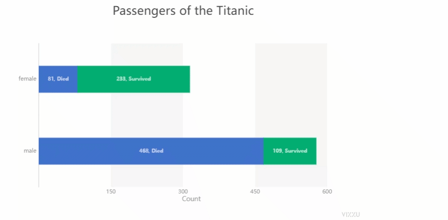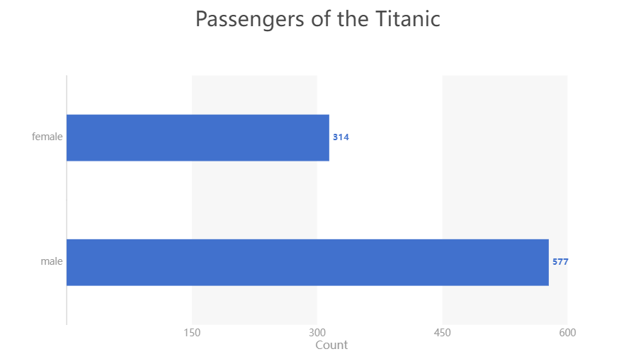 接下来我们开始绘制图表,需要指定好的是图表的一些属性,例如直方图的话就是X轴Y轴该放置什么样的数据,颜色选择是默认的还是需要另外指定的,以及标题等等chart.animate(Config({"x": "Count", "y": "Sex", "label": "Count","title":"Passengers of the Titanic"}))