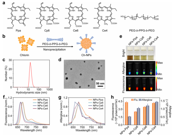 余辉成像具有实现超灵敏生物医学成像的巨大潜力。由于该成像技术能够在光激发停止后进行光子检测,因此其可以有效地消除自身荧光的干扰。然而,目前余辉成像仍然处于初级阶段,这是由于缺乏具有长寿命、高生物相容性和发光亮度的余辉试剂所导致的,特别是近红外余辉的体内应用仍然十分有限。为了解决这些问题,苏州大学高明远教授、苗庆庆教授和李庆副研究员首次报道了余辉发光峰值为680 nm的二氢卟吩纳米粒子(Ch-NPs),其半衰期高达1.5 h,比其他已报道的有机余辉探针几乎长1个数量级。